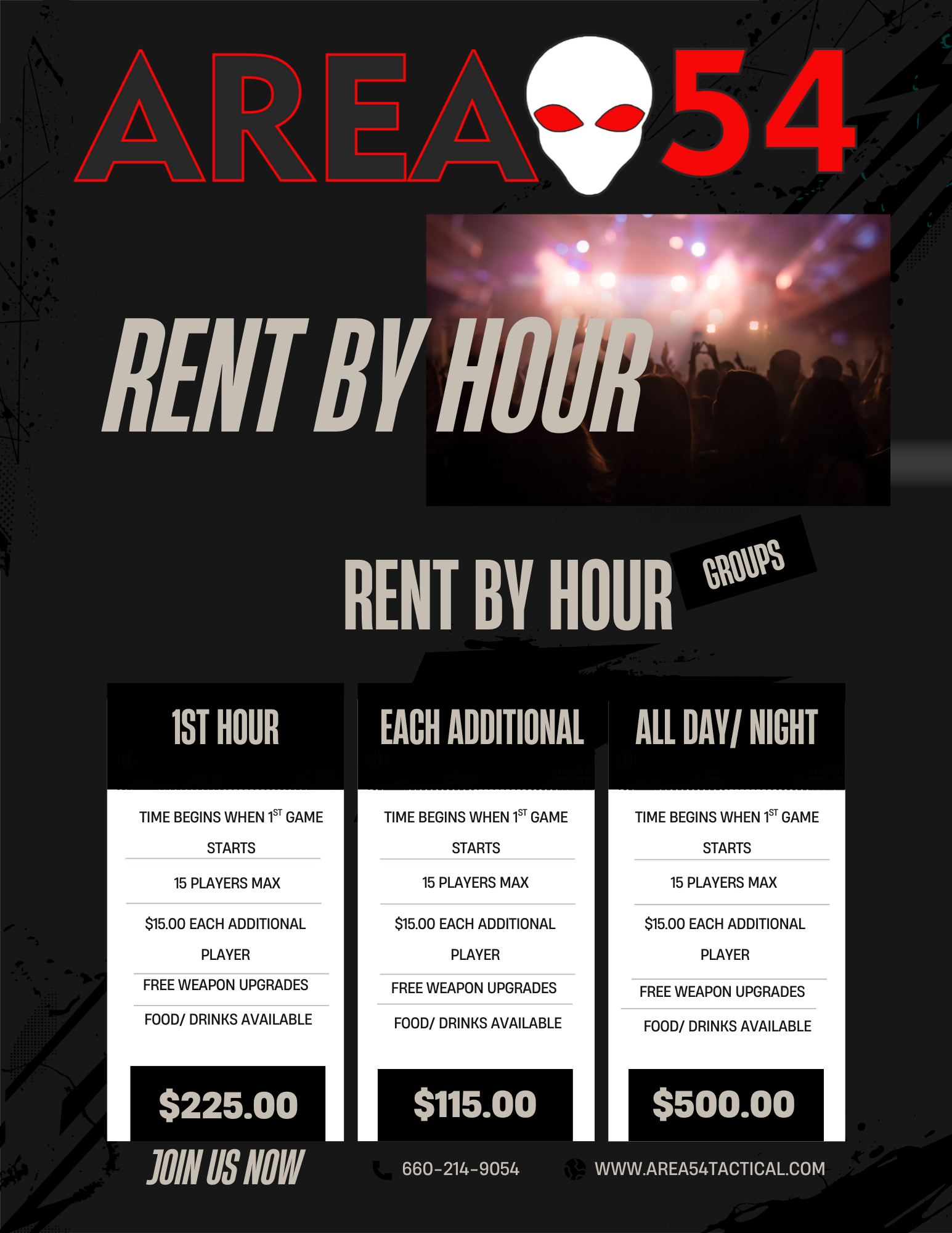 Rent our space by the hour or for the whole day/ night at a discounted rate for a maximum of 15 players. Additional players are welcome for a per player additional fee. The timeclock doesn’t start until the first game begins. When the clock expires, the event is over. Eats & Treats will be open to serve anyone with delicious hot dogs, nachos, and rolled ice cream.