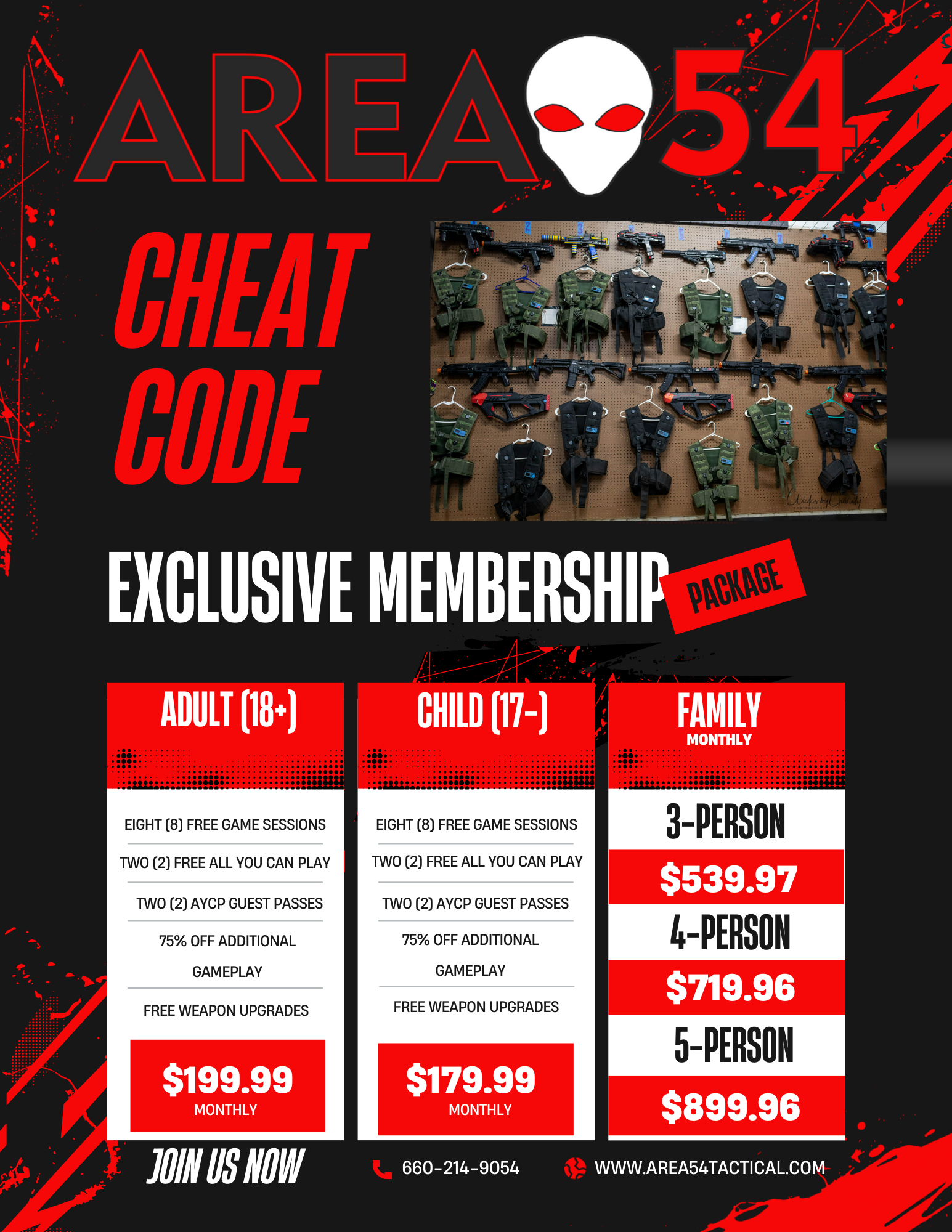 Cheat Code memberships include eight (8) free games per month, two (2) all you can play pass per month, 75% OFF all additional gameplay (parties or private rentals not included), and two (2) all you can play guest passes allowing the guest(s) to play with them for free.