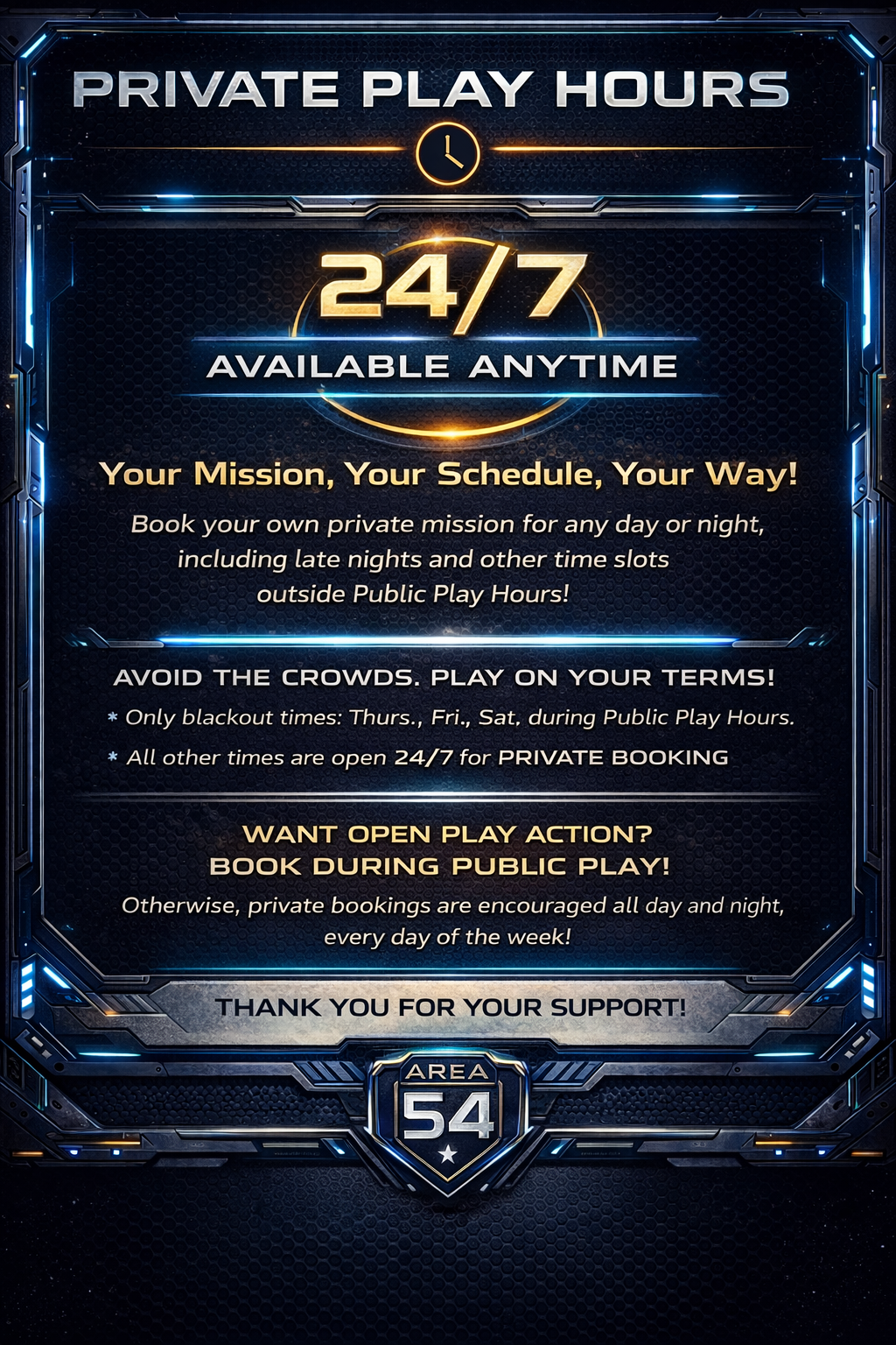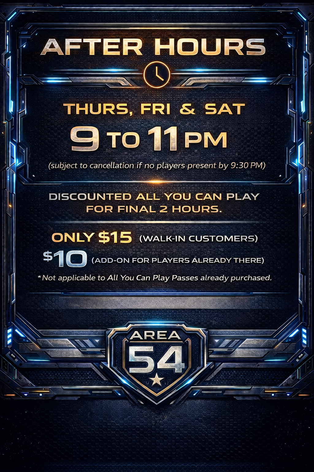 AREA 54 Gift Certificates are now available to be purchased with the following options: Free Gameplay Sessions (1 Session, 2 Sessions, or 4 Sessions) and Cash Value Equivalent ($50, $100, $150).